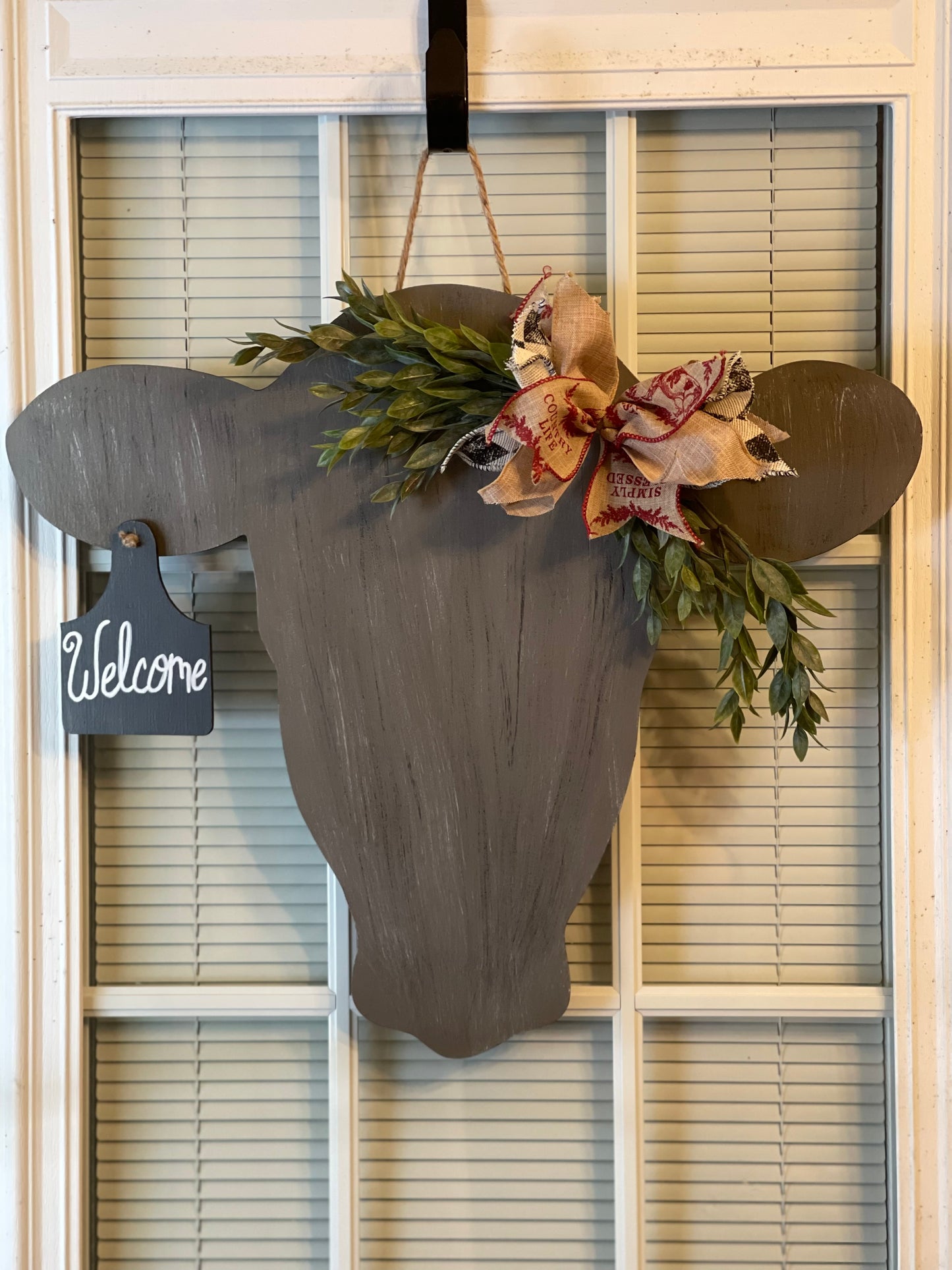 These rustic looking cow door hangers are simple but extremely cute. The tag in the cow's ear can have Welcome, Hello, a Zip Code, or even your last name. The bow and greenery is included. Choose from either grey or black.