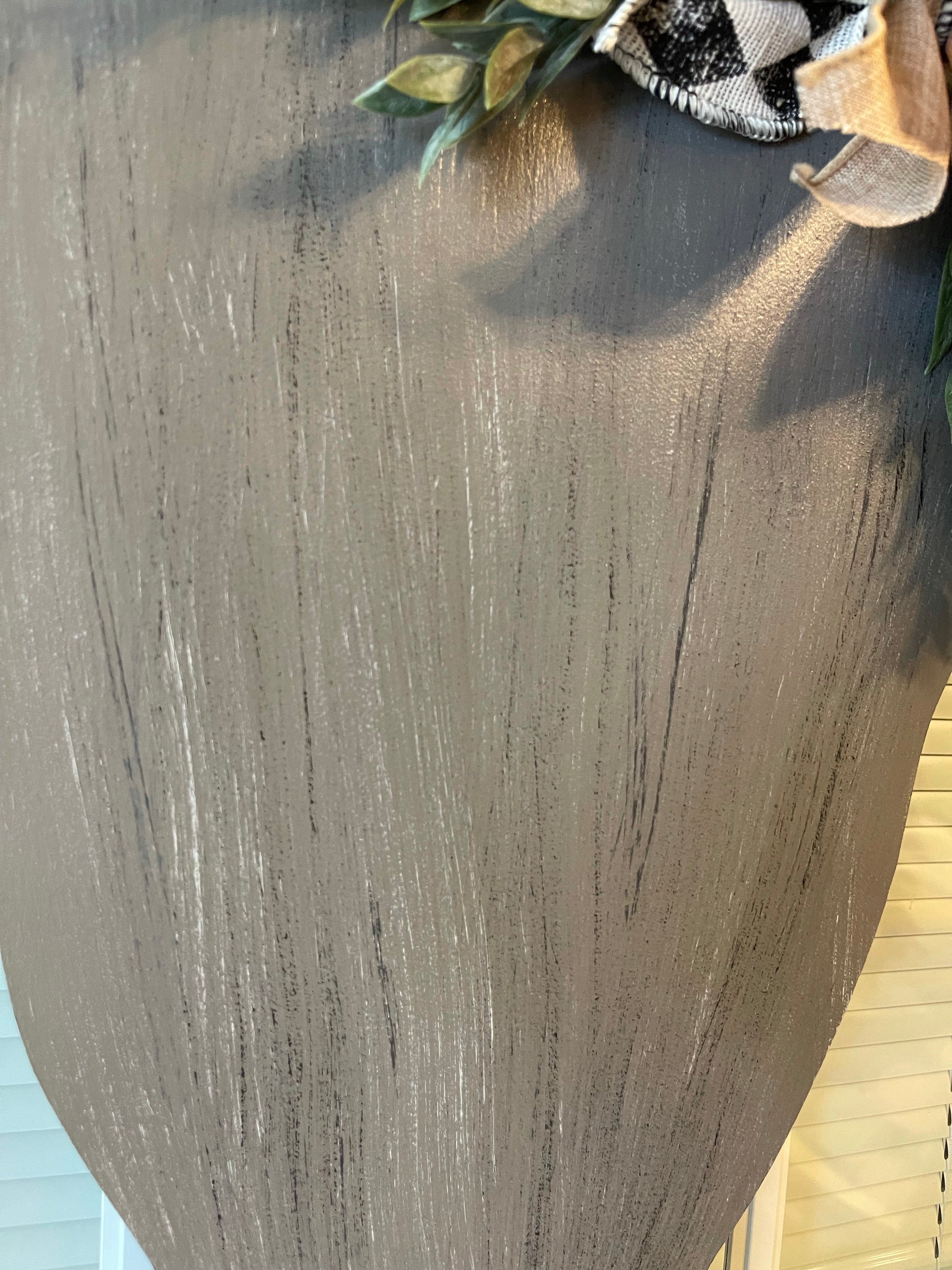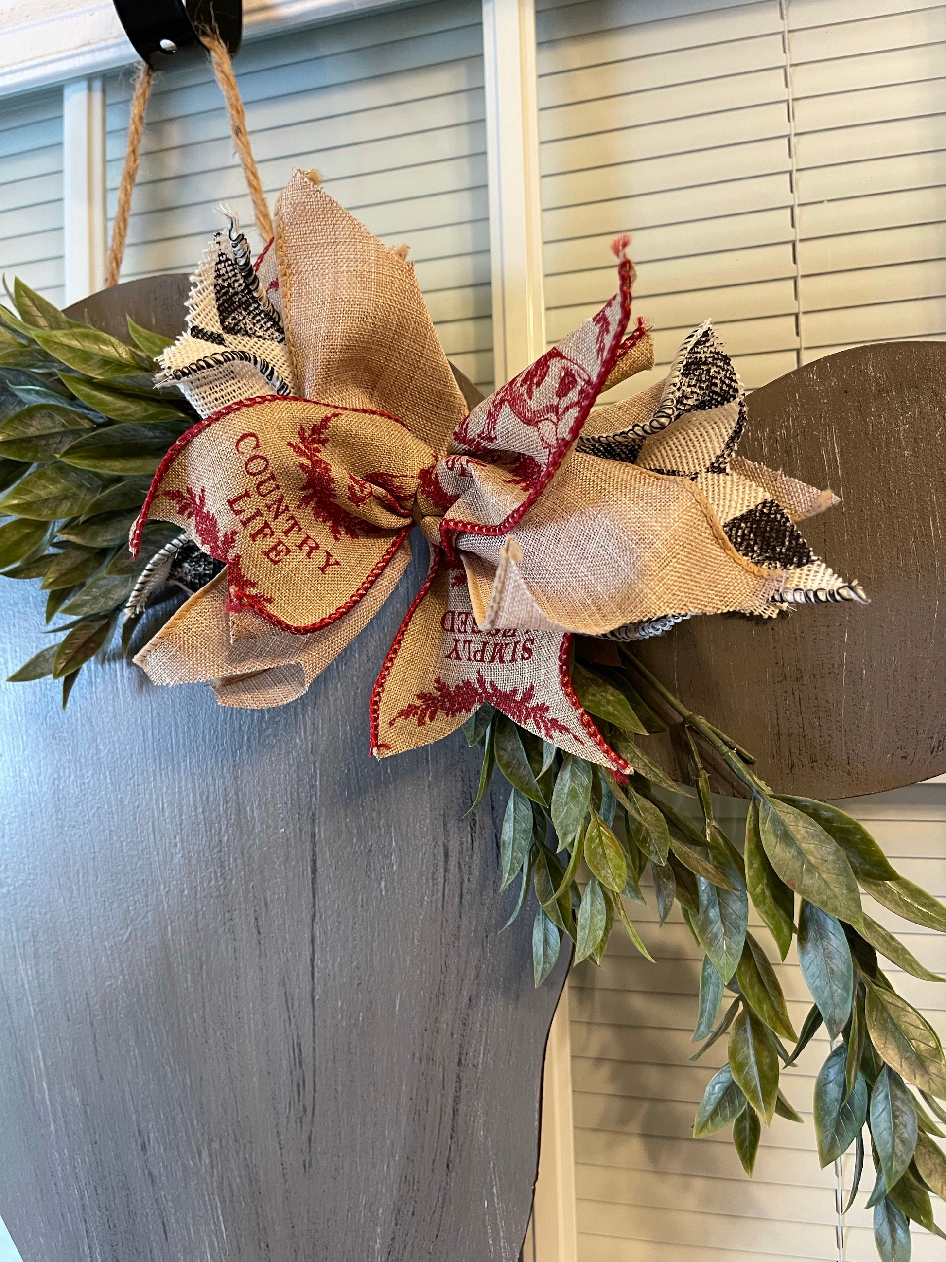 These rustic looking cow door hangers are simple but extremely cute. The tag in the cow's ear can have Welcome, Hello, a Zip Code, or even your last name. The bow and greenery is included. Choose from either grey or black.
