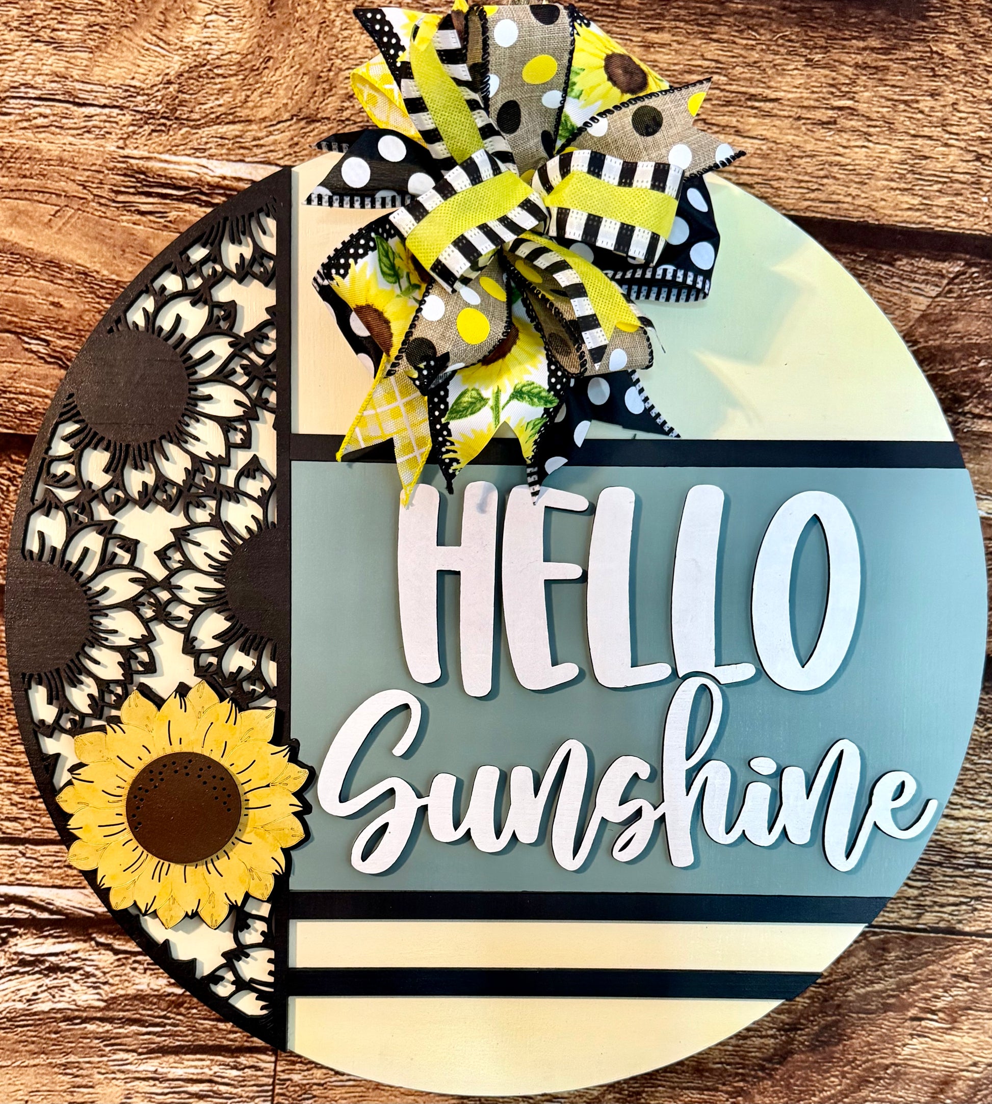 * Sign is laser cut using 1/4" wood for the base and 1/4" wood for the design. Design is applied to the sign using super glue. Quality thick jute is used to hang the sign from a door or on the wall. *Includes a bow. Ribbon used will coordinate with the colors of the sign.